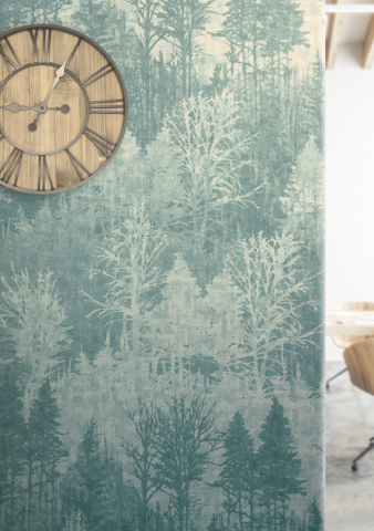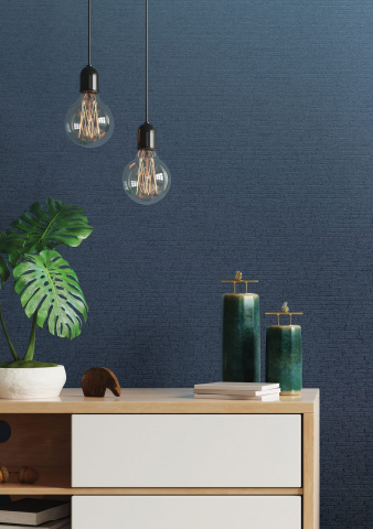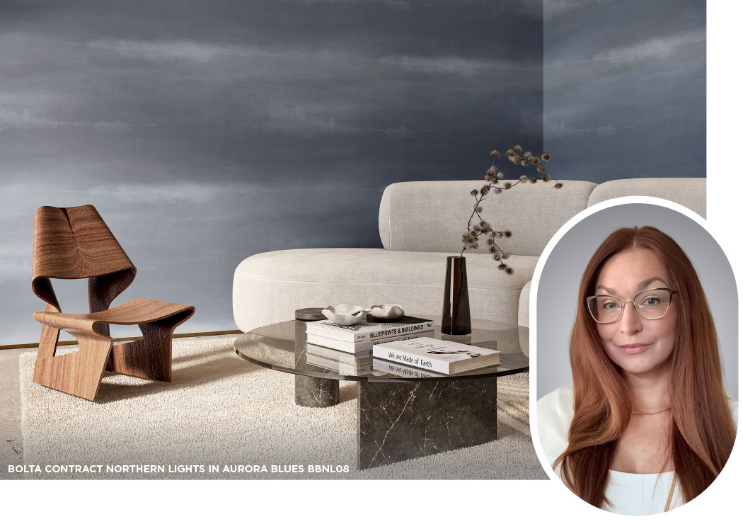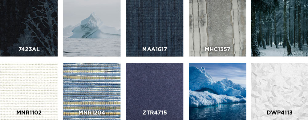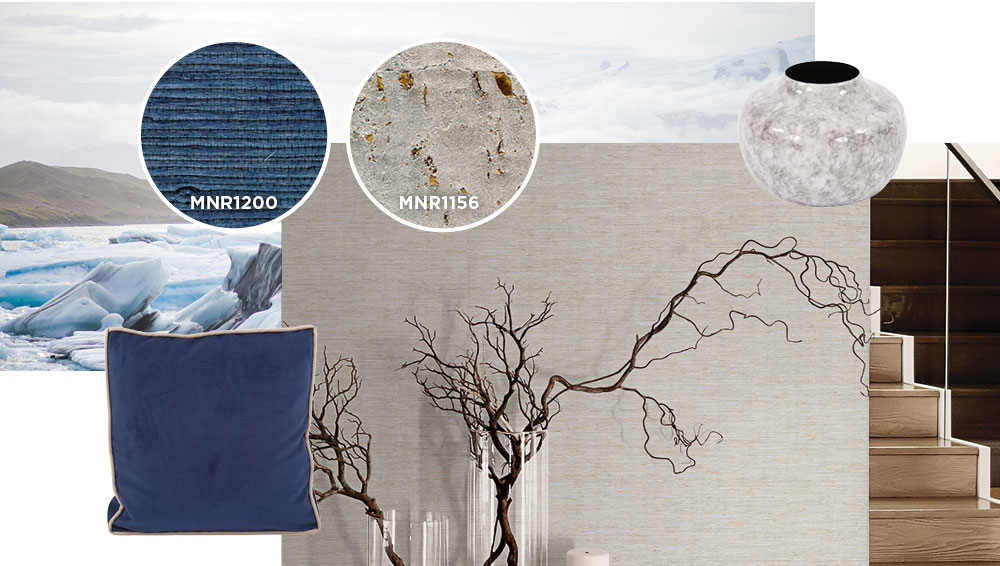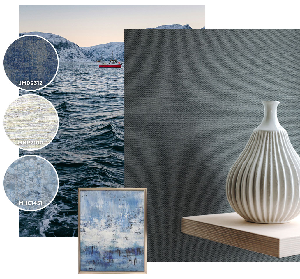 This striking balance is most evident in her deliberate pairing of contrasting textures. She layered the rough, natural feel of Jute Weave with the smooth, metallic finish of Aged Metal. “The mix of rough and smooth textures was intentional to create a rich sensory experience,” Anna says, emphasizing her focus on creating depth and interest through contrast. The serene color palette of deep blues, grays and whites further reinforces this vision, drawing inspiration from the “tranquil yet powerful essence of arctic environments.”