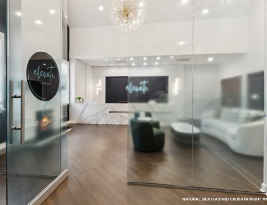 KOO, a Chicago architecture firm, selected Trickle Down, a dramatic gold metallic Type II wallcovering from MDC that immediately eliminates any lingering institutional vibe. The interiors reflect a “respectful juxtaposition of historic details with modern amenities” said Jackie Koo, founder.